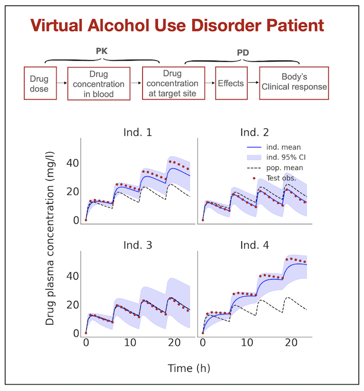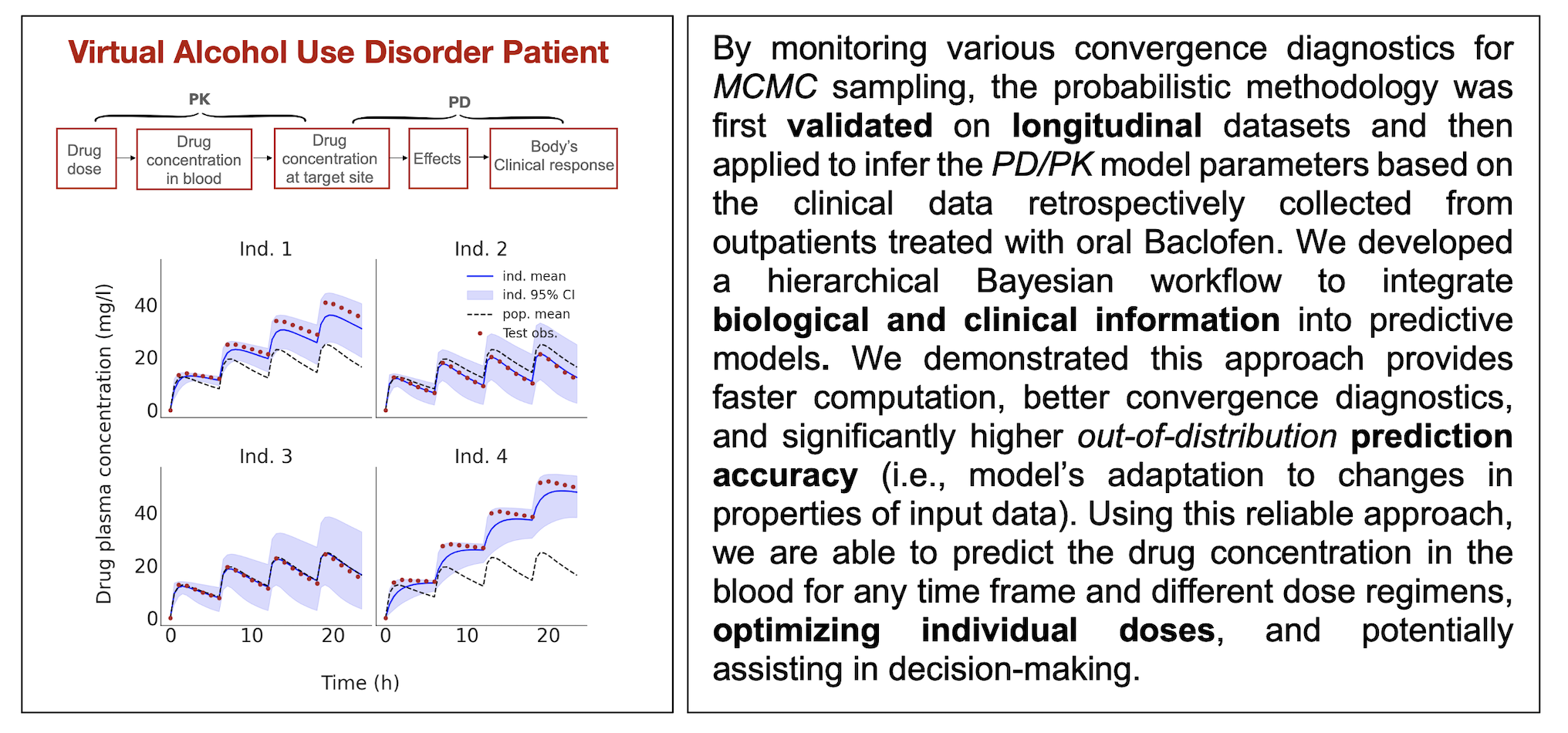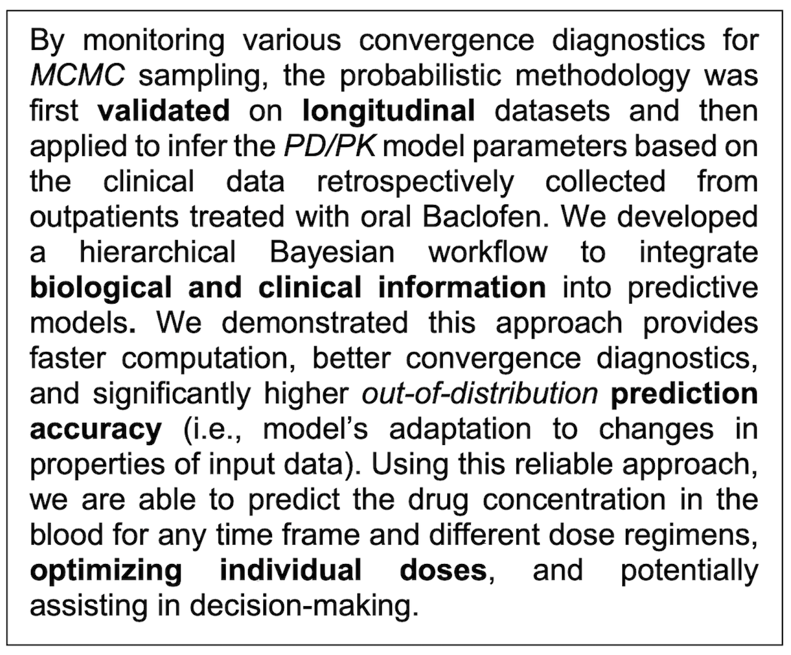 Baclofen, as a selective GABAB receptor agonist, has emerged as a promising drug for the treatment of Alcohol use disorder (AUD). However, the longitudinal inter-trial, and inter-individual variability in drug concentration in patients with AUD is unknown. We developed a hierarchical Bayesian workflow to estimate the parameters of a pharmacodynamic/pharmacokinetic (PD/PK) population model from Baclofen administration. The retrospective clinical data were already collected at Sainte Marguerite Hospital in Marseille by N. Simon, and the work was co-led with V. Jirsa at INS, Aix-Marseille University.