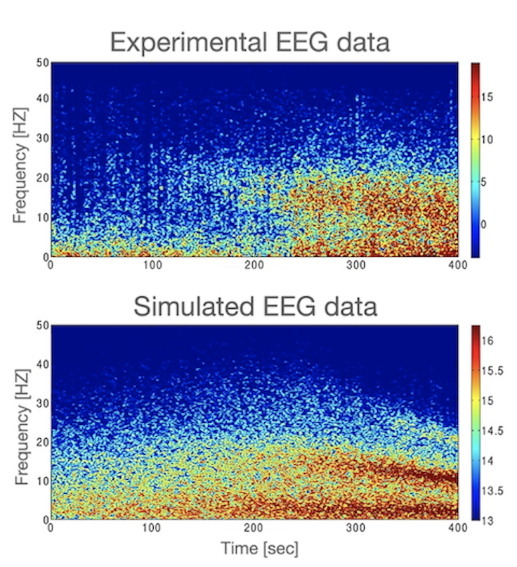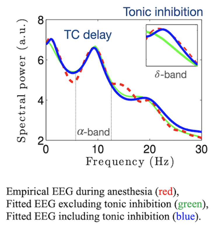 A key finding of this work is that the δ- and α-rhythms arise from fundamentally different mechanisms. Changes in the δ-rhythm primarily result from alterations in (extra-)synaptic GABAergic inhibition, whereas the emergence of the α-rhythm is heavily dependent on the time-delay in the feedback loops between the thalamus and cortex.