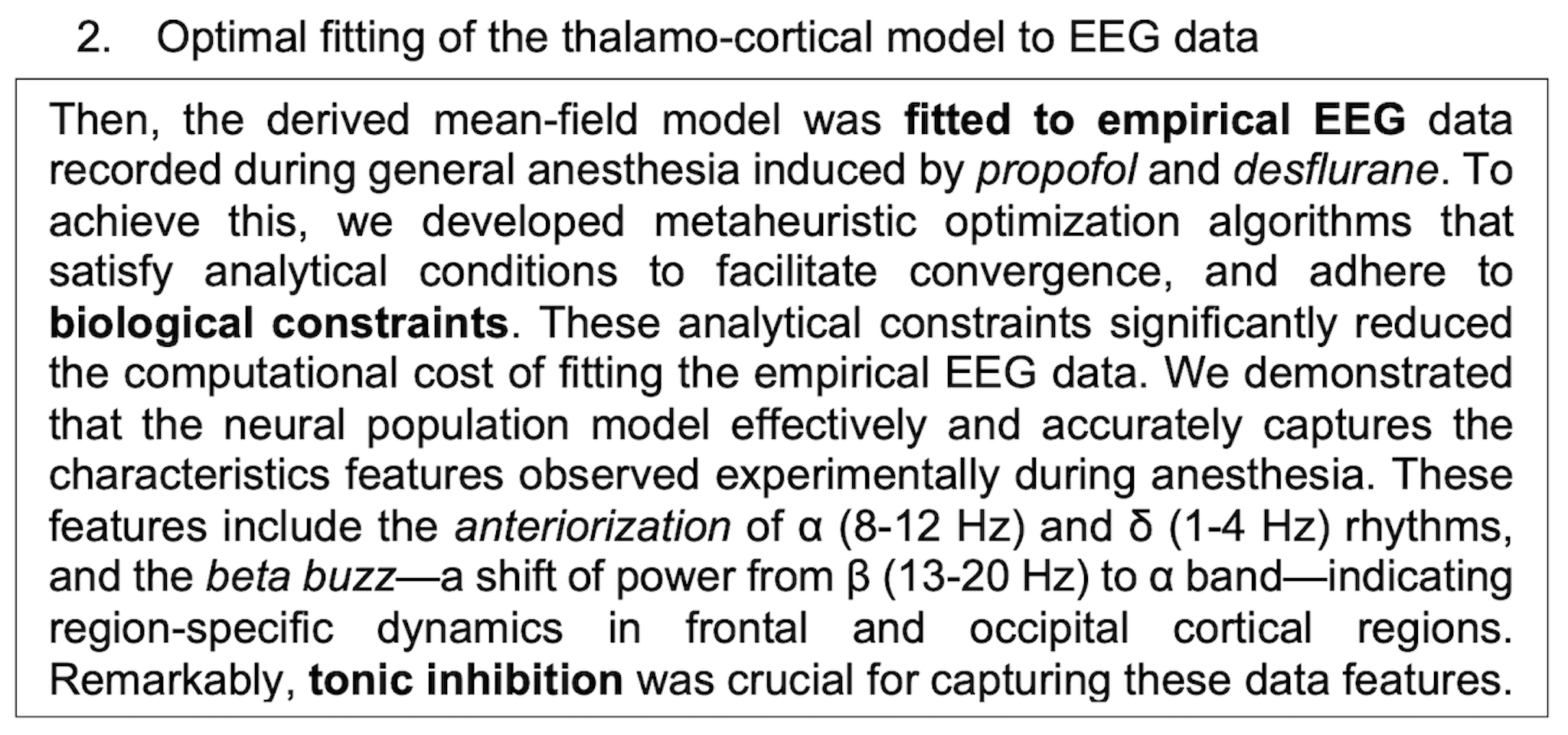 General anesthesia is essential for surgical procedures, yet its precise mechanisms remain elusive. We designed and analyzed a new mathematical framework and implemented bio-inspired optimization techniques to understand how anesthetic actions at the molecular level (receptor occupation, synaptic and extra-synaptic inhibition) translate into measurable EEG signatures of loss and recovery of consciousness. Our hypothesis was that consciousness transitions involve a phase transition in neural dynamics, characterized by a sharp drop in population firing rate, visible in EEG recordings. Testing this required mechanistic modeling and efficient parameter estimation that bridges molecular-to-systems levels while remaining computationally tractable.