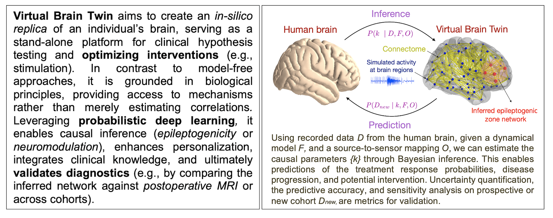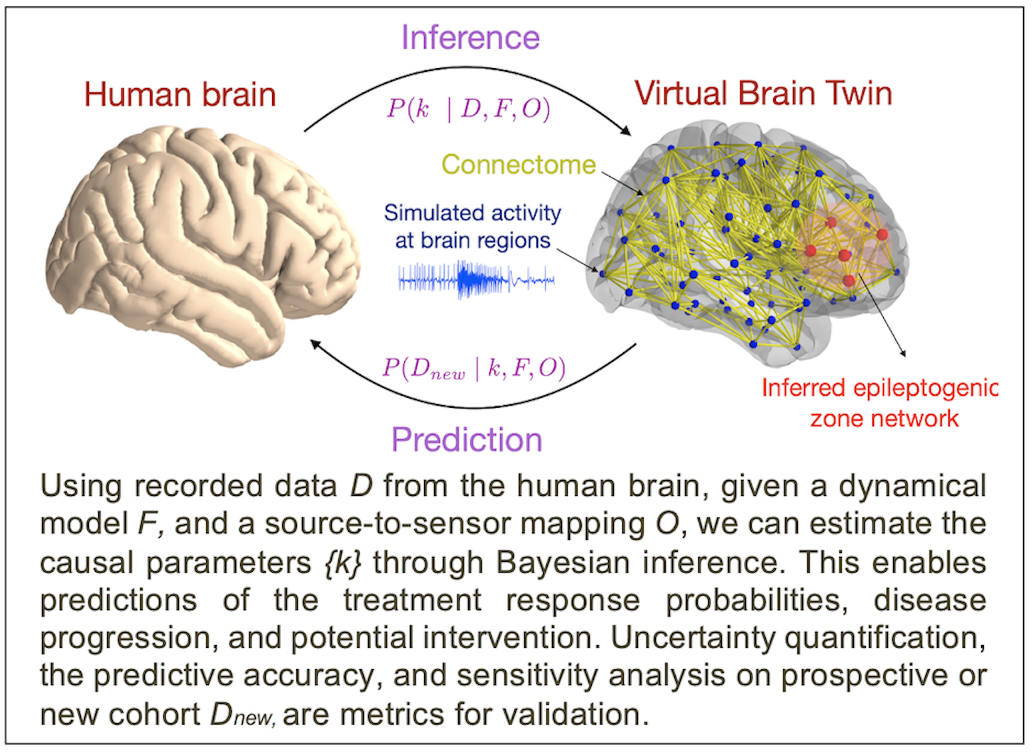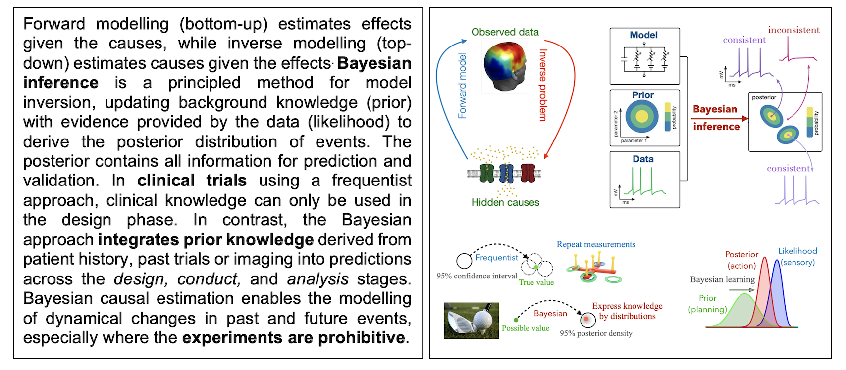 This work integrates Bayesian inference with advanced computational models to enhance clinical decision-making for a range of brain conditions. By combining heterogenous data and inference algorithms, this approach provides causal/mechanistic insights into brain (dys)function, improving prediction accuracy and potentially therapeutic strategies.