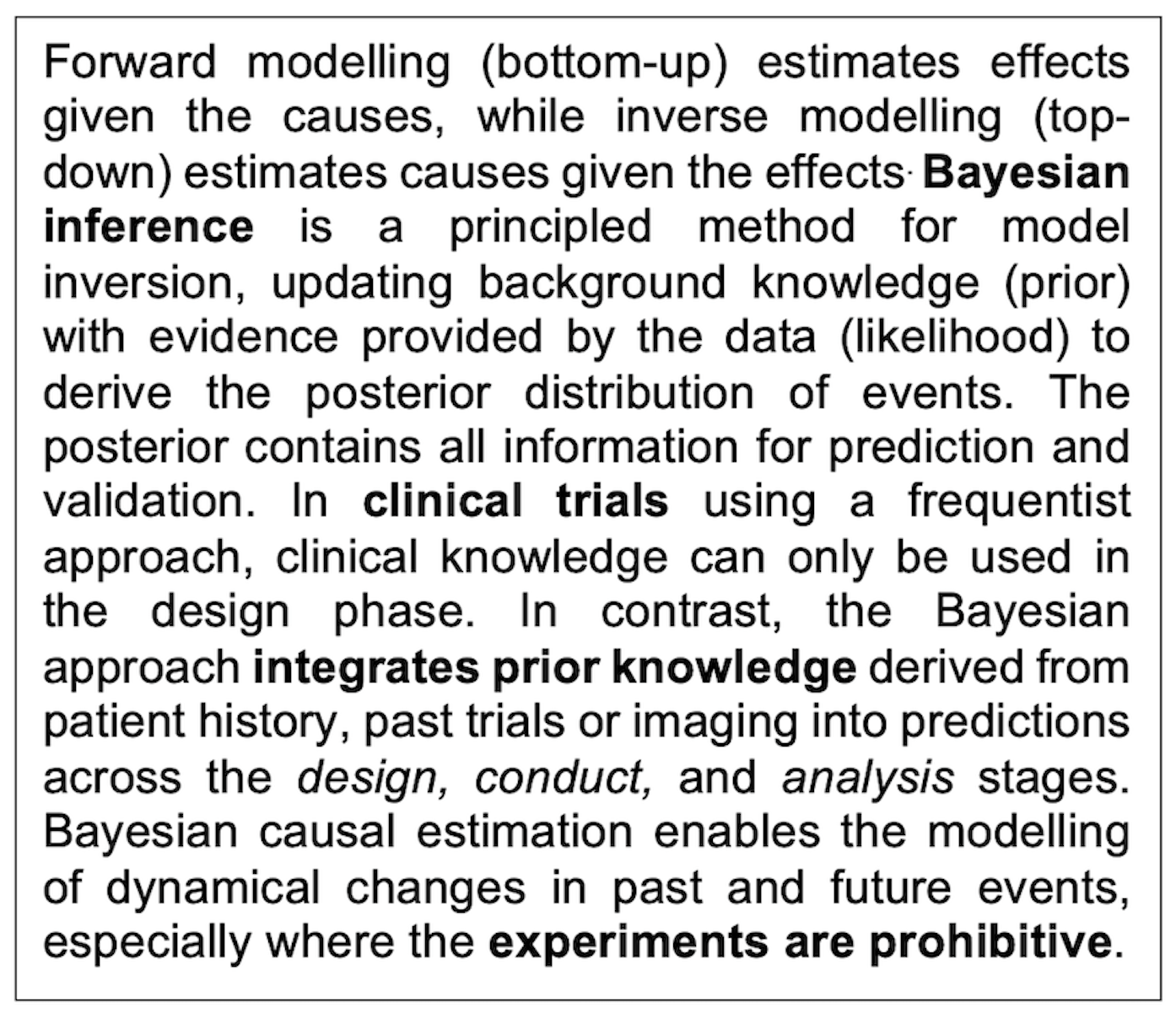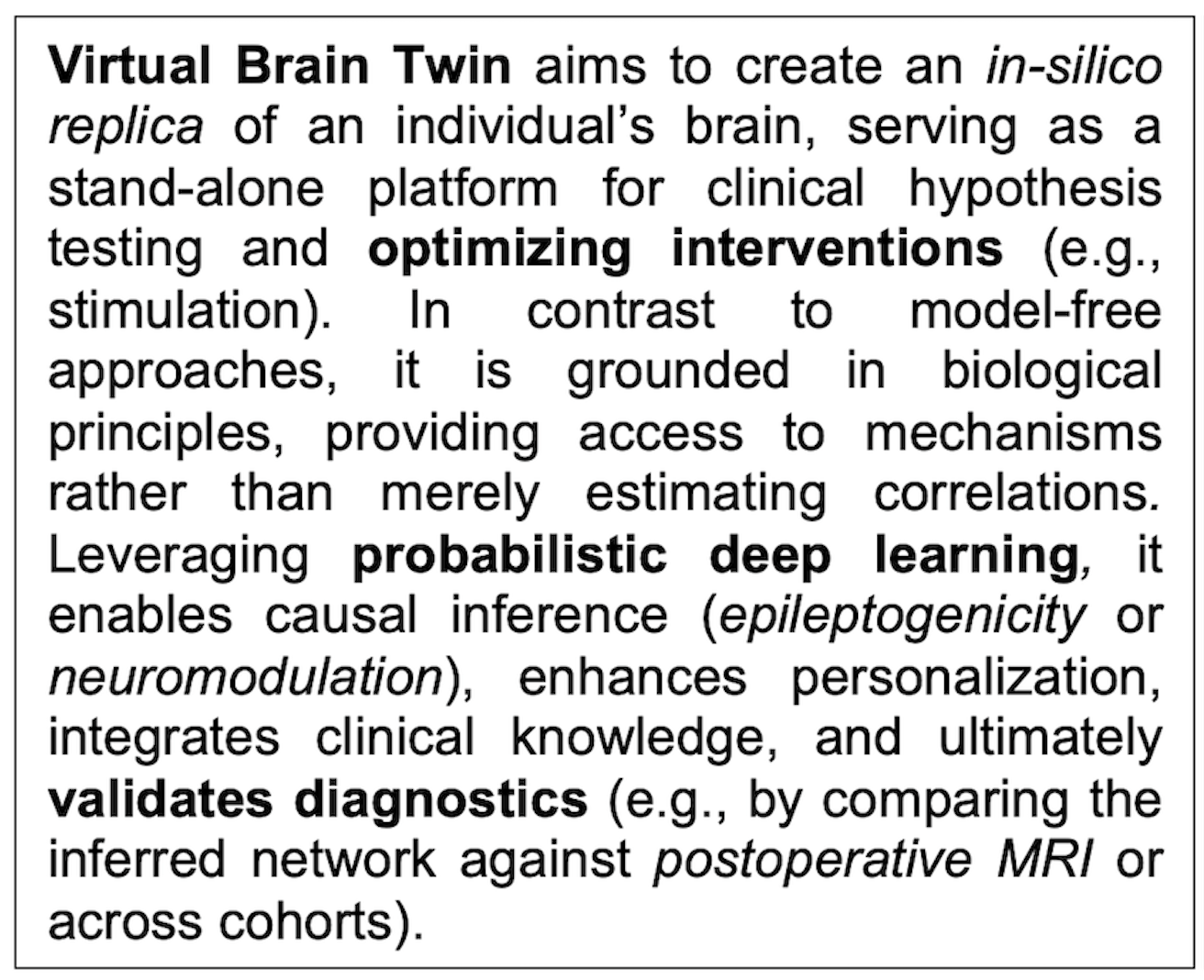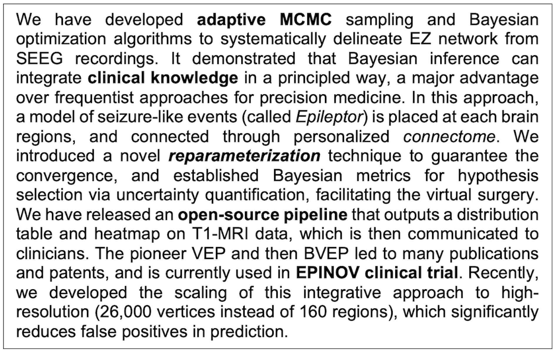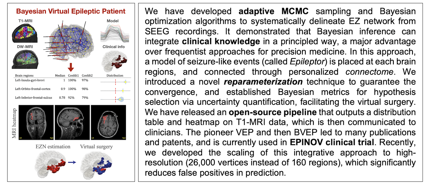 This work integrates Bayesian inference with advanced computational models to enhance clinical decision-making for a range of brain conditions. By combining heterogenous data and inference algorithms, this approach provides causal/mechanistic insights into brain (dys)function, improving prediction accuracy and potentially therapeutic strategies.