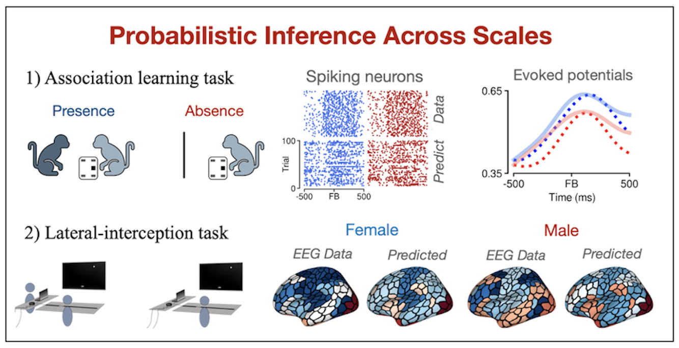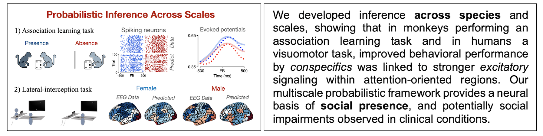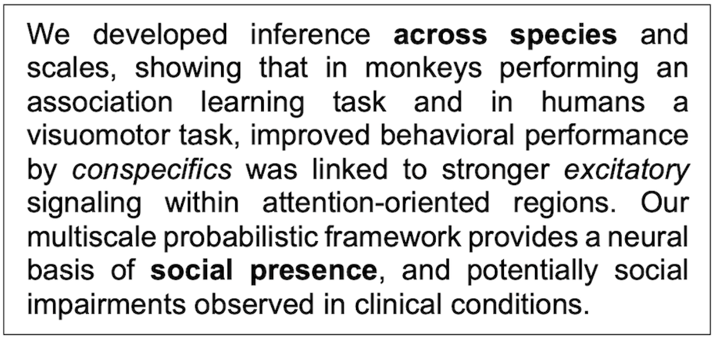 An important open question is how the activity of neural subpopulations during behavior reflects their causal function. Challenges such as time-scale, granularity, along with averaging methods, obscure patterns of individual cell activity. For instance, the influence of social presence on behavior has been among the focal points of investigation in social psychology for over a century; however, its underlying neural mechanisms remain unknown. We attempted to bridge this gap by investigating how the presence of conspecifics changes effective connectivity from measurements across brain scales (single neurons, ERPs, and EEG). We provided a solution by investigating how the presence of others alters excitation/inhibition balance across brain scales—from single neurons and evoked potentials to whole-brain EEG. This study was conducted on published data by D. Boussaoud and conducted by A. Esmaeili funded by Marie Skłodowska-Curie Actions.