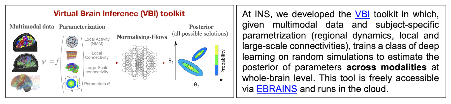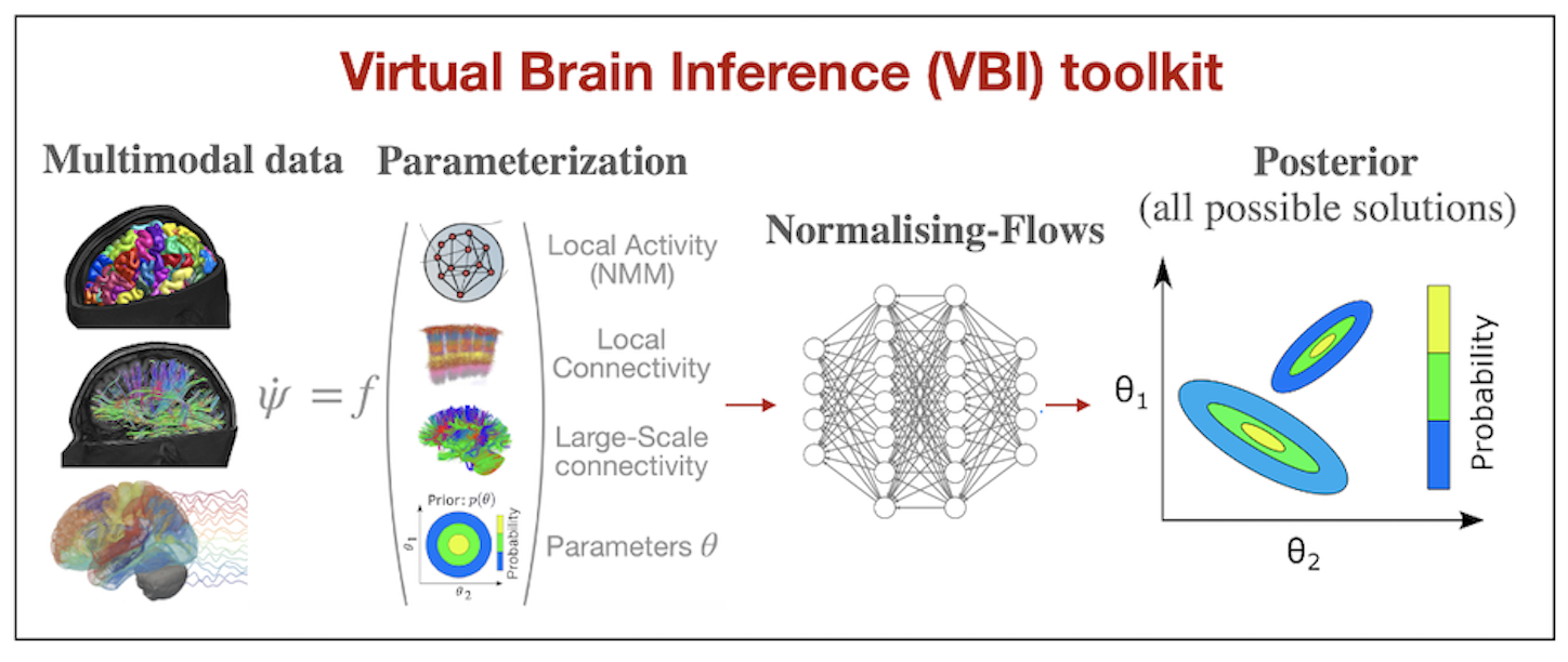 MCMC succeeded in epilepsy due to the invasive SEEG implantation available only to surgical candidates. To impact the broader patient population, inference must scale to non-invasive recordings. However, these modalities present different challenges: lower temporal resolution (fMRI: 1-2 sec), lower signal-to-noise (EEG/MEG from scalp vs. intracranial), Longer recordings without discrete "events" like seizure onsets, and more computationally expensive forward models (e.g., hemodynamic equations). To address this, we developed a likelihood-free method leveraging advanced deep generative algorithms (called normalizing-flows) to learn the posterior from simulations; If we can simulate the forward model (generate synthetic SEEG/EEG/fMRI from hypothesized parameters), then we are able to train a neural density estimator to learn the inverse mapping (between data and posterior) without explicit computing the likelihood and Markovian property. Then, funded by the EBRAINS 2.0, we designed an open-source toolkit called VBI, implemented by A. Ziaee, and the work was co-led with V. Jirsa used in multiple international collaborations, demonstrating its generality and robustness.