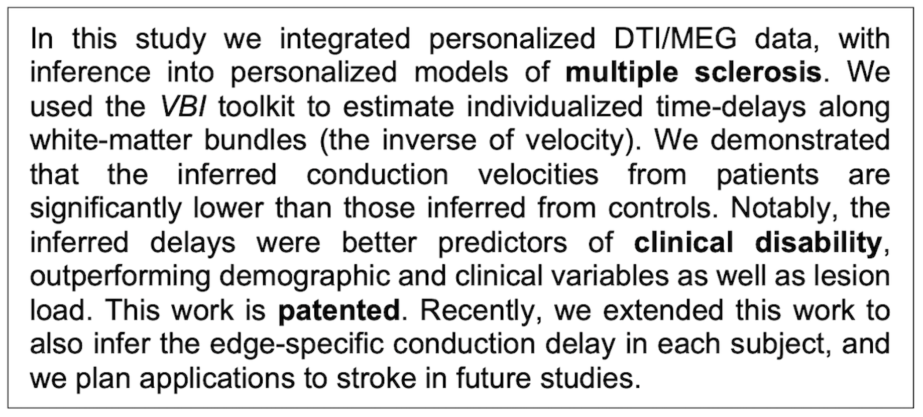These studies led to the development of Virtual Brain Twins—digital replicas of individual brains designed to assist decision-making in diagnostics, prognosis, and therapy. Recently, we summarized these advances in a detailed review paper, covering the conceptual, mathematical, technical, and clinical aspects. We described the stages of their construction—from anatomical coupling and modeling to simulation and inference—and demonstrated case studies in resting state and neurological disorders.
