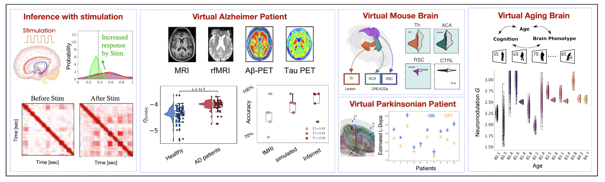 Using the developed inference tools, several (international) collaborations were then conducted to construct mechanistic/causal frameworks for studying brain (dys)functioning; In stimulation, we showed that perturbing brain states is effective for estimating the level of degradation in the limbic system, which is patented. In Alzheimer’s disease, we combined structural brain topographies with excitotoxicity or postsynaptic depression to model how Aβ and pTau affect neuronal activity. Inference showed that excitotoxicity is a necessary mechanism to replicate key biomarkers, such as reduced fluidity (i.e., the switch between networks to cognitive demands), improving prediction over traditional methods. In Parkinson’s disease, from EEG data and deep electrodes placed near the subthalamic nuclei, we correctly inferred dopaminergic changes before and after L-Dopa administration. In healthy aging, causal inference showed increased neuromodulation as a compensation mechanism for inter-hemispheric degradation in individuals with high cognitive performance. In Virtual Mouse Brain, we showed that the targeted interventions (thalamic lesions, and chemogenetic silencing) in a specific region can influence the activity throughout the entire brain.